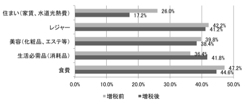 特に住まい(家賃、水道光熱費)については増税前に調査した26.0%から17.2%と大きく割合が減っています。