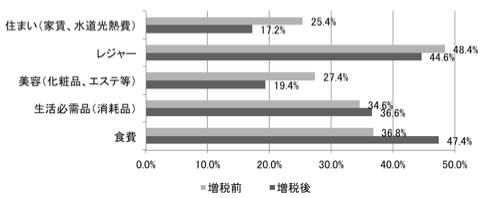 一方、生活必需品(消耗品)と食費については、増税前の調査結果よりも減らしたと回答している割合が増加しています。