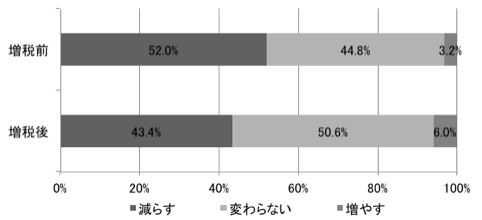 一方、生活必需品(消耗品)と食費については、増税前の調査結果よりも減らしたと回答している割合が増加しています。