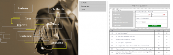 『Choibo.biz』は『Choibo.info』に世界中から集まったYes/Noクエスチョンとその回答データを、「質問のジャンル」「期間」「国」「性別」「年齢」などを任意に設定してダウンロードすることが可能なウェブサービスです。ダウンロード以外にウェブブラウザ上で簡易な集計結果を閲覧する機能を有しています。