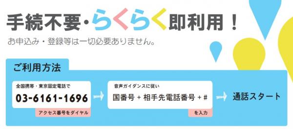 国際電話部分の料金は無料になり、通常の日本国内通話料金だけで、海外にいるビジネスパトーナ、家族、またはお友達との国際電話が自由に楽しめます。