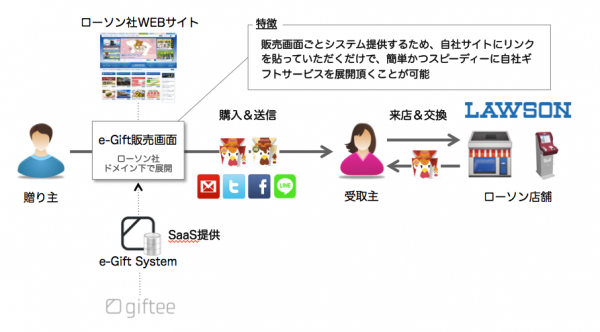 ギフトサービス「giftee」を運営する株式会社ギフティ(本社:東京都品川区、代表取締役: 太田睦)は、2014年6月10日(火)より株式会社ローソン(本社:東京都品川区、代表取締役社長:玉塚元一、以下「ローソン」)に、ローソンの店頭で交換できる商品を顧客がLINEやFacebookを通して、ギフトとして贈りあうことができる、ギフト販売システム「e-Gift System」の提供を開始いたしました。