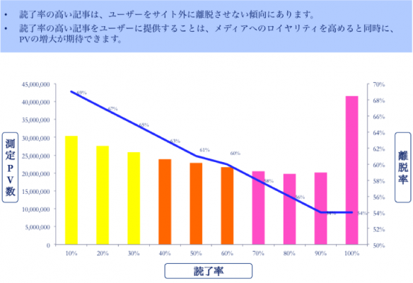 多くのニュースメディアはPV数を最重要のKPIとしていますが、ページの内容へのユーザーの満足度を知るためには、記事の読了状況(熟読したのか、流し見したのか)を把握しなければなりません。しかし、PV数には、どの程度情報が伝わったのかという「PVの質」の観点は含まれていません。また、PV当たりの平均滞在時間は、記事に含まれる情報量による影響を大きく受けるため、読了状況を正確に反映できていません。