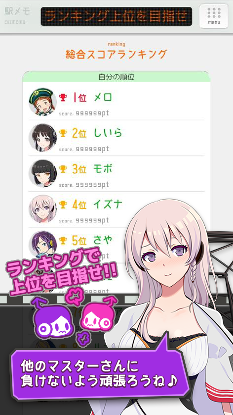 「ステーションメモリーズ!」(略称「駅メモ!」)は、日本全国の駅を集めてまわる駅収集位置ゲームです。位置登録を利用して駅をGETし、『でんこ』と言われるパートナーを駆使してプレイヤー同士でその駅をどれだけ長く保持できるか競い合います。また駅を集めることで称号を集め、駅を集めた数などで競い合うランキングモードでより深く楽しむことができるゲームになっています。日本全国さまざまな駅を巡ってどんどんコレクションして遊ぶ、位置ゲーム要素満載のコンテンツです。