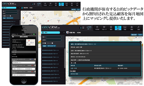 電子行政オープンデータ戦略に伴い、大手企業が様々な行政データを活用し独自で調査やサービスを検討しております。ジオジェネはスマートフォンを通じて現在地付近の見込顧客へ導き、営業日報と連動させた究極のクラウドサービスです。誰でも閲覧可能な行政機関が保有する公的ビックデータを原典データとし、独自のノウハウにより最速で見込顧客を割り出し、GEOCRM上の地図にマッピングします。地番データと相続、売買、更地化、抹消情報から割り出された見込顧客情報を、中小中堅のリフォーム/不動産業界向けに毎月最速で提供します。