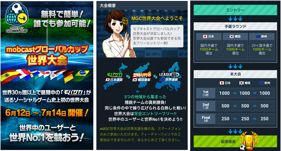 mobcast Global Cup(以下、MGC)とは、mobcastが誇る人気モバイルオンラインサッカーゲーム「モバサカ」(http://sc.gmpa.jp/index.html)上で開催されるソーシャルゲーム上初の国際大会です。過去2回に渡って実施されたMGC日韓戦では、日本と韓国のユーザーのべ15,000人以上が参加し、活発なカードトレードや、応援書き込みが展開されるなど、両国のプライドをかけた実戦さながらの熱いバトルを繰り広げました。
