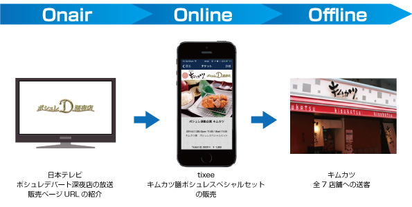 日本テレビ ポシュレデパート深夜店(6月12日、26日放送予定 ※関東ローカル)内でキムカツ膳ポシュレスペシャルセットの紹介を行います。視聴者はtixeeの販売ページで食事券の購入ができます。購入した食事券はキムカツ店舗(全7店舗で使用可能)で店員にもぎってもらい、使用することができます。また、食事券をもぎった後の画面には、『無料お食事券』、『カツサンドプレゼント』、『10%OFFクーポン』のいずれかをランダムで表示させるなどの特典もついています。