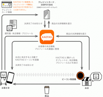 「KAOTAS」はBluetooth Low Energy技術(BLE)を利用して、iPhoneアプリをインストールしたお客さまが来店するとお店に設置したビーコンに反応、自動で店舗にチェックインを行います。また、インターネットで利用されているオンラインショッピングの仕組みを通常のお店でも活用し、顔パスでハンズフリー決済を実現しています。