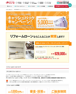 『 リ ノ コ 』でリフォームローンを申し込み、ご成約頂いたお客様の「先着20名様」に「5,000円の商品券」をキャッシュバック(http://www.renoco.jp/campaign/02.html)させて頂きます。