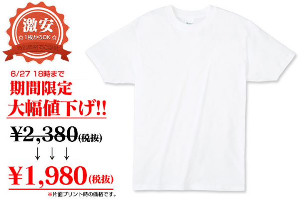 最近話題のオリジナルTシャツをまだ作ったことがない方に楽しんで頂く為に、販売開始記念として通常2,380円のライトウェイトTシャツを、期間中に限り業界最安値1,980円(当社調べ)で購入頂けるキャンペーンを実施します。