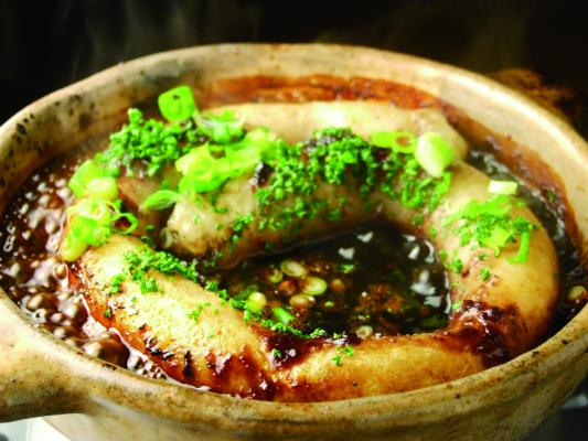 新鮮な牛の小腸をドンと使った名物料理。専用グリラーで焼いた後、味噌を加えた赤ワインソースで味付けし、再度天火で焼き上げました。