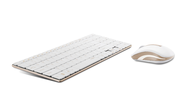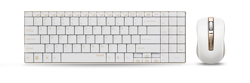 rapoo 9160 は、好評の5.6mmウルトラスリムデザインキーボートと高性能マウスのコンポジットセットモデルで、キーボード本体がリッチゴールドに輝くステンレスボディの限定バージョンである。