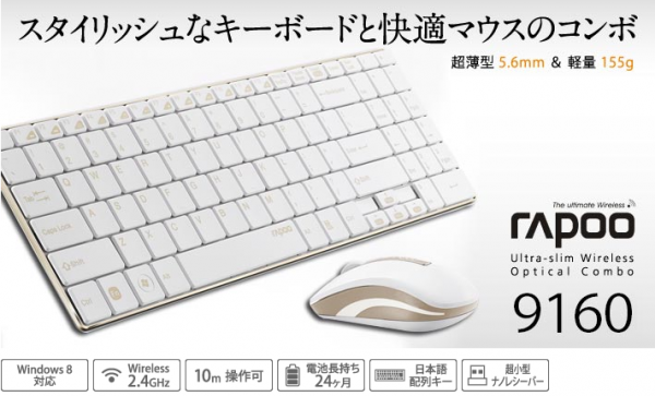 rapoo 9160 は、好評の5.6mmウルトラスリムデザインキーボートと高性能マウスのコンポジットセットモデルで、キーボード本体がリッチゴールドに輝くステンレスボディの限定バージョンである。