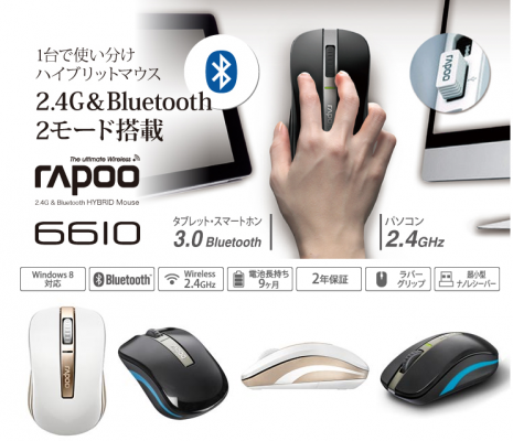 rapoo 6610 は、Bluetoothを搭載したパソコンやスマホ・タブレットにはBluetoothで接続。通常のパソコン等では付属のUSBレシーバーにより無線接続可能のハイブリット接続により、使う機器や場所を選ばない。