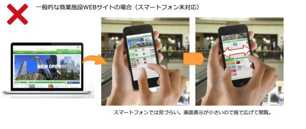 スマートフォンをご利用になるお客様にとって、PCむけに作られた既存の商業施設WEBサイトは、ページの情報が小さくて見づらいものです。フロアガイドなども見やすく便利になります。また、スマートフォン専用ページ(URL)を構築する必要が無いため、WEBサイト構築時および、情報更新などの運用コスト削減に繋がります。