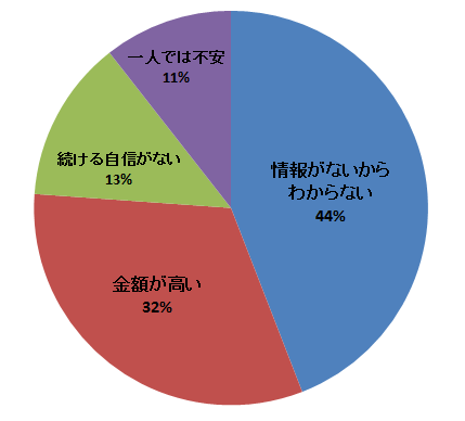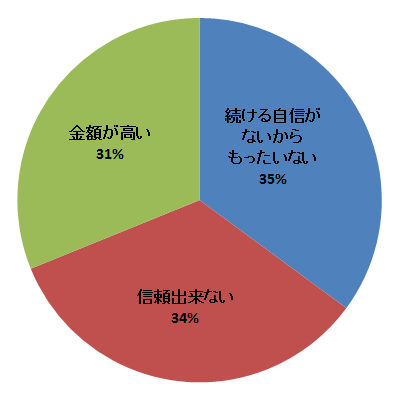 中でも「続ける自信」という自身の内部的要因より「価格面で手が出ない」、「情報が信用できない」といった外部的要因の意見が多かった。