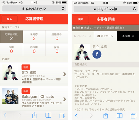 左:応募が有った時の画面 右:応募者詳細画面( f のボタンから応募者のFacebookが閲覧可能 )