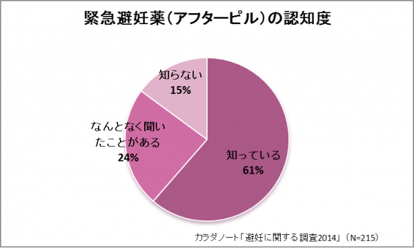 また、避妊具にまつわるトラブルや強姦など、緊急の場合に用いられる緊急避妊薬(アフターピル)についても調査しました。「緊急避妊薬(アフターピル)を知っていますか?」という設問で、「知っている」と答えた女性は61%、「なんとなく聞いたことがある」24%、「知らない」15%でした(N=215)。