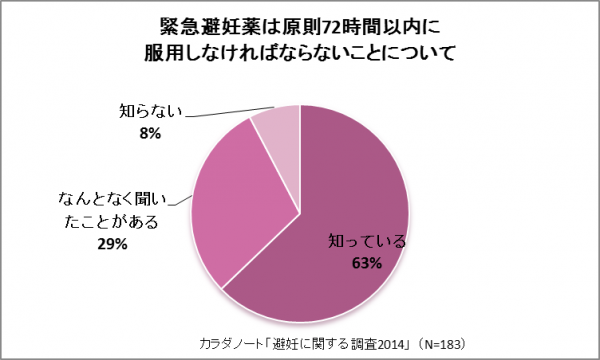 さらに、緊急避妊薬(アフターピル)を「知っている」、「何となく知っている」と答えた女性183人に「避妊失敗から原則72時間以内に服用しなければいけないことを知っていますか?」と質問しました。その結果、「知っている」と回答したのは63%。「なんとなく聞いたことがある」29%、「知らない」8%でした(N=183)。