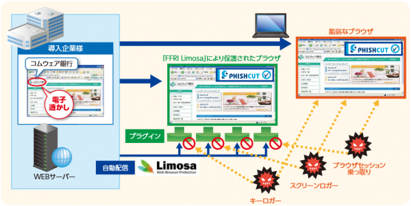 「FFRI Limosa」は、多くのネットバンキング向けの端末用セキュリティ対策製品と異なり、利用者がネットバンキングサイトにログインする際に、自動的に保護モジュールをWebブラウザに適用するため、利用者が自らセキュリティ対策製品を事前にダウンロードする必要がありません。そのため、ネットバンキング利用者を自動的に保護することが可能であり、高い効果が見込めます。