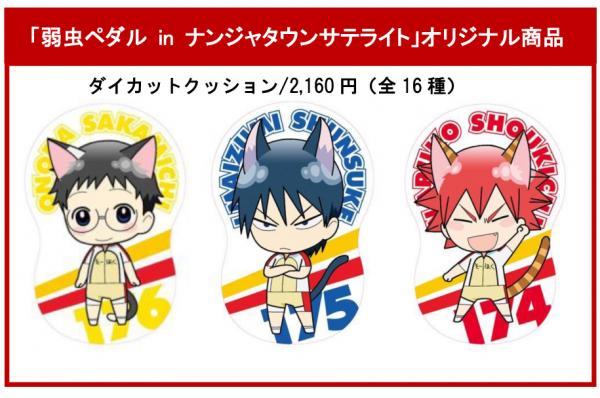 グッズコーナーでは、「弱虫ペダル」の関連グッズを取り揃えるほか、ナンジャタウンで販売されている限定デザインのオリジナルグッズが一部再登場します。さらに、「弱虫ぺダル in ナンジャタウンサテライト」のオリジナル商品「ダイカットクッション」(税込2,160円/全16種)が順次登場予定です。