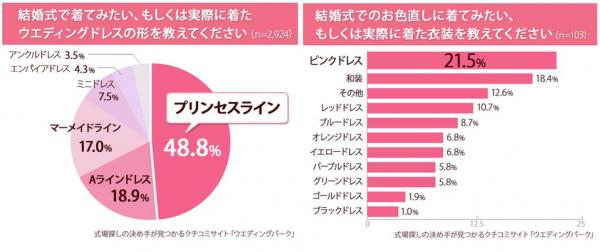 また『結婚式でのお色直しに着てみたい、もしくは実際に着た衣装を教えてください(単一選択)』という質問では「ピンクドレス(21.5%)」が一番で次に「和装(18.4%)」が選ばれました。