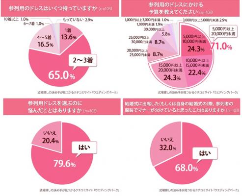 『参列用のドレスはいくつ持っていますか(単一選択)』という質問では、「2~3着(65.0%)」が一番多く、また『参列用のドレスにかける予算を教えてください(単一選択)』という質問では7割以上の人が「5,000円以上~20,000円未満」である事がわかりました。