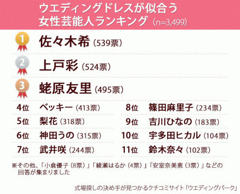 ■ウエディングドレスが似合う女性芸能人ランキング 1位「佐々木希」2位「上戸彩」3位「蛯原友里」