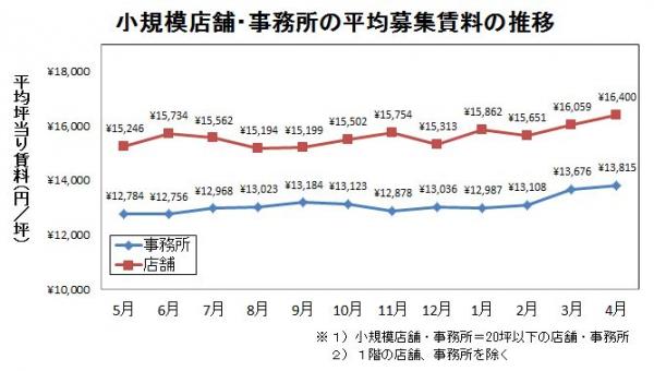 小規模店舗の平均募集賃料は、5月に前月から2.1%上昇し、1.6万円台半ばに達しています。