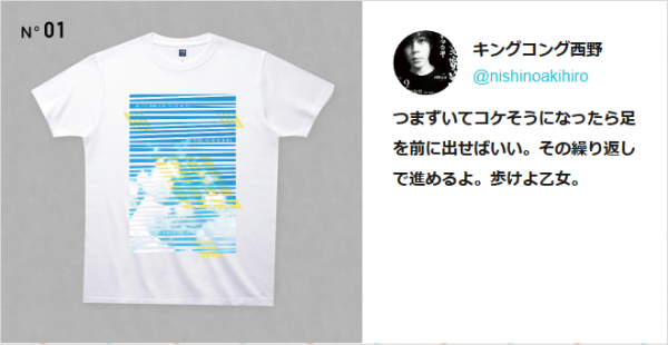 まずはキングコング西野 亮廣さん、レイザーラモンRGさん、ロバート山本 博さんを含める5名の芸能人のツイートをデザインしたTシャツ販売からスタートいたします。今後はタレント、アイドル、スポーツ選手、文化人へと幅を広げていき、様々な著名人のオリジナルTシャツを『ENJOT』にて販売していく予定です。