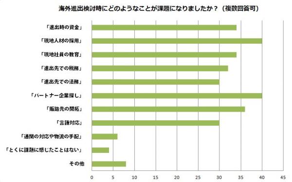 続いて、海外進出を検討した中で、各企業がどんな「課題」を感じたかについて質問しました。