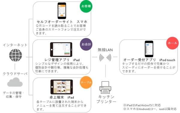 今回販売を開始する「レジコ」は、導入コストを抑えることができるスマートデバイスを活用しており、お客様の注文、厨房、配膳状況、お会計情報等のあらゆる情報をiPad及びiPod touchで操作し、そのデータを管理することが可能です。また、シンプルで操作しやすいデザインを採用していることから、お客様からのオーダー受付や会計操作を初心者でも簡単に行うことができ、さらにクラウド上のサーバに保存されたデータと端末を同期させることで、常に最新の情報でサービスを提供することができます。