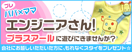 医療・健康系モバイルサービスを展開する(株)プラスアール(本社:東京都港区、代表取締役:佐藤竜也)はこのたび、妊娠・出産・育児の経験を生かしたい「(プレ)パパ・ママエンジニア」を対象に、採用キャンペーンを開始します。期間中に弊社へお越しいただいた(プレ)パパ・ママエンジニアさん全員に、スタイ(よだれかけ)を1枚プレゼントします。「まずは話を聞いてみたい」という方から「明日にでも働きたい!」という方まで、まずは気軽に遊びに来て下さい。サービスや会社についてなど、弊社エンジニアがなんでもお答えします。