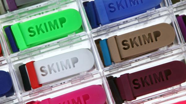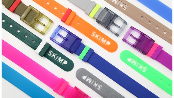 「SKIMP」初の商品化されたラバーベルトで、クリアハードケース入、オリジナルマーカー入と2種類あります。商品開発のきっかけは、日本への旅行の際、空港での不快なセキリュティーチェック時にフランス人デザイナーは思いつきました。金属を使用しない、ネオンカラーを基調とした、明るいカラーが特徴です。ラバーべルトである為、丈夫で天候も気にせず使用可能です。