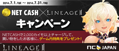 PC向けオンラインゲーム『リネージュ2~Epic Tale of Aden~(以下、『リネージュ2』)』をサービス、運営しているエヌ・シー・ジャパン株式会社(東京都渋谷区、代表取締役:金 澤憲(キム テクホン))は株式会社エヌ・ティ・ティ・カードソリューション(東京都港区、代表取締役社長:浅田 安茂)の協力を得て「NET CASH×LineageIIキャンペーン」を実施いたします。
