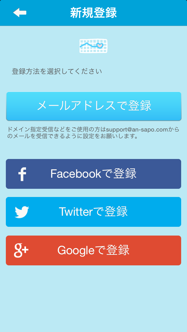 ※メールアドレスでユーザー登録をしている方がSNS連携に変更したい場合は、アカウント設定画面([設定]-[アカウント設定])にてSNS連携を設定した後、アン-サポ・サポートまでご連絡いただければ、メールアドレスを削除させていただきます。