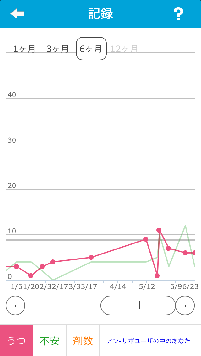 ココロの状態推移をグラフで確認できるほか、お薬手帳とも連動し服用剤数の変化も同時に確認できます。また全国のアン-サポ・ユーザーと自分の状態を比較することもできます。