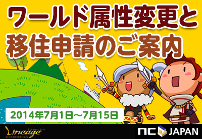 PC向けオンラインゲーム『リネージュ~Eternal Life~(以下、リネージュ)』をサービス、運営しているエヌ・シー・ジャパン株式会社(本社:東京都渋谷区、代表取締役:金 澤憲(キム テクホン))は、『リネージュ』のアカウントをお持ちのお客様を対象に、「Detection! your Lineage」と題しゲームワールドの属性変更に備えたワールド移住申請を本日より実施いたします。