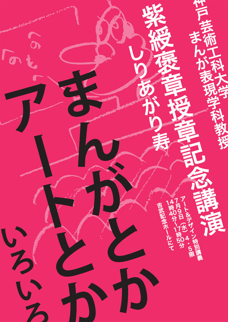 学校法人谷岡学園 神戸芸術工科大学(神戸市西区、学長:齊木崇人)では、2014年春に紫綬褒章を授賞した まんが家であり、本学 先端芸術学部まんが表現学科教授 しりあがり寿による公開特別講義を開催いたします。