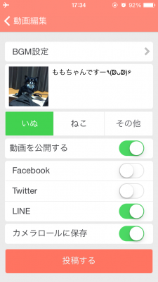 PiVidのカメラで撮影した動画に限らず、既にカメラロールに保存されている動画も編集して投稿することができるので、可愛いペットの動画があれば新しく撮る必要なく公開することも可能です。