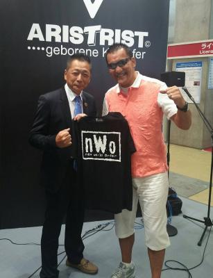 7月2日、東京ビッグサイトで開催されている展示会『ライセンシングジャパン』のイングラムブース内で記者会見を開いた蝶野代表は、自身が運営するアパレルブランド・アリストトリストと米WWEのダブルライセンス商品として、nWo Tシャツを発売することを発表。nWoといえば、蝶野代表が中心となり、1990年代後半に日米で一大ムーブメントを起こしたユニットで、Tシャツについては記録的な売り上げを誇り、日本国内で40万枚近く売り上げたといわれています。