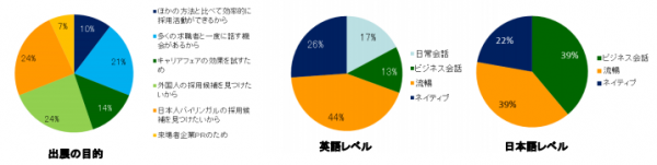 企業のキャリアフェア参加の目的は「日本人バイリンガルの採用候補を見つけたいから」と「外国人採用候補者をみつけたい」が同数で 24%。