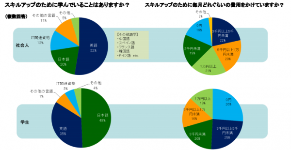 スキルアップのために学んでいることとして英語、日本語を含む語学を上げる人が社会人では 83%以上、学生では91%という結果になりました。