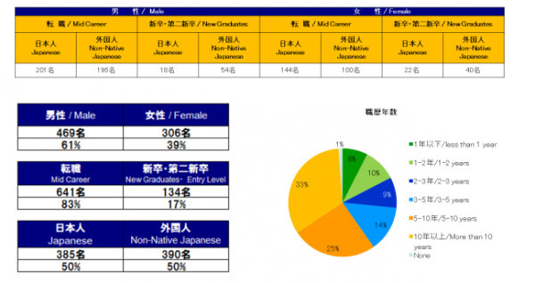 来場した転職希望者 775 人(日本人:外国人 ほぼ半数)の 72%が 3 年以上のビジネス経験者で、国籍については日本を含む 50 ヶ国の方々にご来場頂き国際色豊かなイベントとなりました。