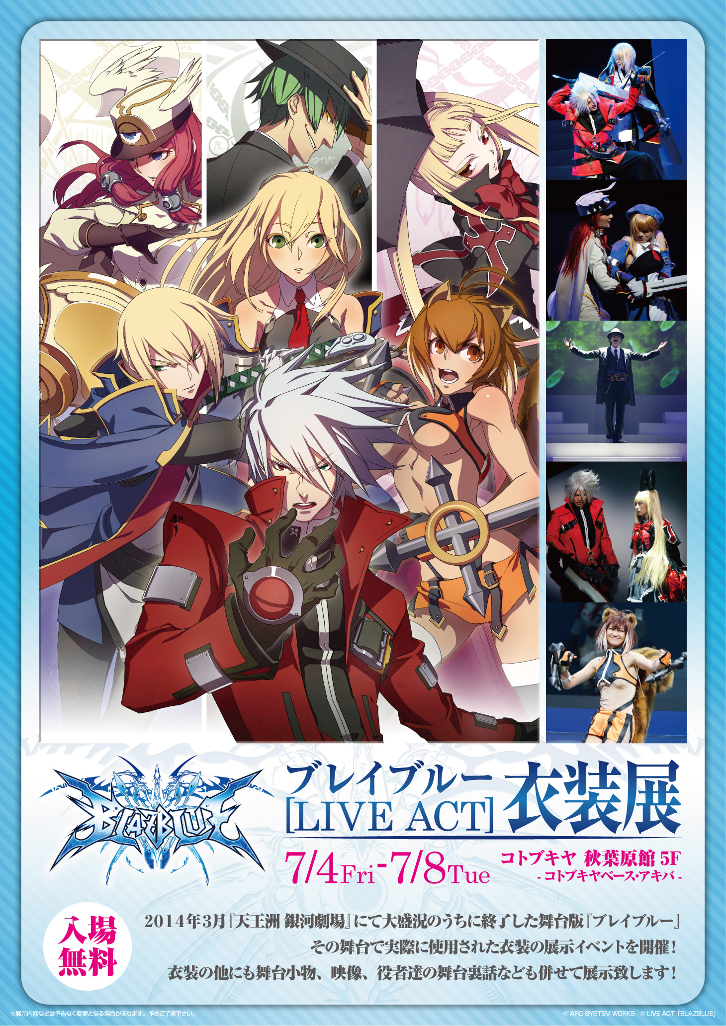 ARK SYSTEM WORKSの人気アーケードゲーム「ブレイブルー」の舞台版「ブレイブルー[LIVE ACT]」は、2014年3月に公演され、大盛況のうちに終了しました。今作で出演者たちが実際に使用した衣装や舞台小物など、貴重な品々を見る事ができる展示イベントとなります。そのほか、舞台の映像や出演者たちの制作秘話を記載したパネルなども展示します。