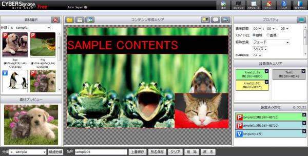 「サイバーサイネージ『Free Edition』」は、デジタルサイネージ端末の画面の一部に同社のロゴ等がクレジット表示され、配信端末台数は10台まで等の制限はあるものの、コンテンツには4Kを含めた静止画・動画・テロップ・Flash・音声などの素材が利用でき、ハイクオリティなデジタルサイネージの運用が可能である。