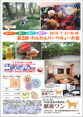 ホテルや旅館、ゴルフ場等の運営を通してリゾートの再生・活性化を推進するリゾートソリューション株式会社(略称・リソル、東京都新宿区、多賀道正社長)が栃木県・那須高原で運営する源泉掛け流しの宿「ペット&スパホテル那須ワン」では、「RESOLわんわん倶楽部」会員を対象にした第2回『わんわんバーベキュー大会』(下記参照)を2014年7月21日(月・祝)に14室限定で実施、現在、参加者を募集しています。