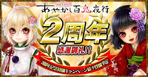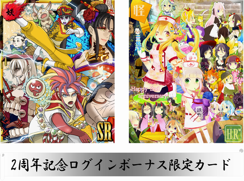 あやかし百鬼夜行は7月13日(日)に、Android版のリリースから2周年を迎えます。これを記念して、先日行われた人気投票で上位を獲得したキャラクターを中心に、魅力ある妖怪を集めた期間限定の福袋ガチャをリリースいたします。また、プレイヤーの皆様に感謝の気持ちを込めておためし価格のガチャや、お役立ちアイテム満載のガチャも登場!その他、2周年記念期間のログインスタンプにて記念カードのプレゼントや、無料ガチャ大強化キャンペーンなど、特別企画を随時開催予定です。