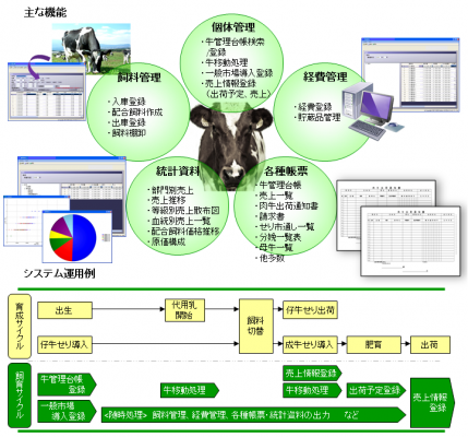 牛管理台帳検索/登録、牛移動処理、一般市場導入登録、売上情報登録、(出荷予定、売上)