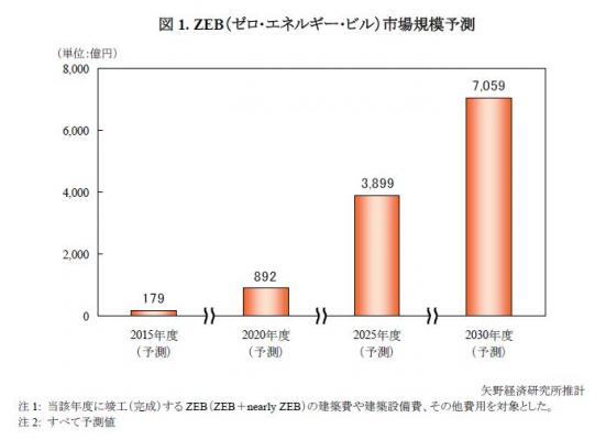 ◆ ZEB市場は2015年度に立ち上がり、2030年度には7,059億円に拡大と予測